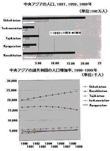 さて、中央アジア諸国のほとんどがこの期間大きな人口爆発を経験したが、その勢いは今日もつづいている。1897年の最初のロシア・センサス人口から1959年のセンサスまでに、中央アジア人口には1,050万人から2,470万人に増加をした。最新の1989年のソビエト・センサスによれば、中央アジアの人口は4,950万人と更に倍増している。中でもタジキスタン、トゥルクメニスタン、キルギスタン、ウズベキスタンは人口倍増に30年もかかっていない。