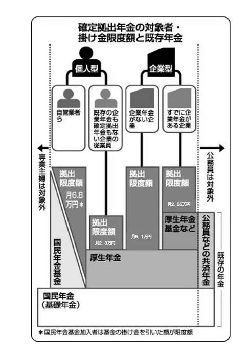 企業年金等厚生年金基金老齢厚生年金給付の一部を国に代わって支給できる特別な企業年金。1966(昭和41)年から個々の職域単位ごとに創設。現在、厚生年金加入者の14%が基金にも加入している。基金には企業年金独自の上乗せ給付もある。代行相当分を支給するため、基金は厚生年金保険料の一部を厚生年金本体に納入することが免除され(その保険料は「免除保険料」とよばれ、2.4〜5.0%の間で定められている)、それぞれの基金内部で積み立てている。運用利回りが低下し たとき未積立ての年金債務に苦悩したため、解散したり代行を返上した基金が多い。代行なし基金は基金型企業年金とよばれる。 税制適格年金退職給付の事前積立の器として1962(昭和37)年に創設された年金。法人税法に規定された諸要件を満たす必要がある。大半は一時金取得となっている。既存の税制適格年金は2012年3月までにすべて廃止。その受け皿の一つとして規約型企業年金が用意される。規約型の場合、年々の財政検証、5年に一度の財政再計算、情報開示等が義務づけられる。 確定拠出年金掛金建ての年金であり企業型と個人型の2種類。通称は日本版401k。2001(平成13)年10月スタートの企業型は労使合意に基づいて設立され、掛金は事業主が拠出する。拠出時非課税扱い。60歳未満の従業員が加入し、年金資産の運用も従業員が指図する。離職に際して持ち運びが可能(ポータビリティつき)。給付は一時金でも受給可。02年1月創設の個人型は個人拠出のみであり、国民年金基金連合会が実施する。公務員や専業主婦は企業型・個人型のいずれにも加入できない。企業の退職給付前払い制度のひとつとして利用され始めた(図参照)。 ハイブリッド型年金[hybrid-type pensions] 国民年金基金自営業者等、非給与所得者用の年金上乗せ制度。1991(平成3)年度に創設。地域型(都道府県別)と職能型の二つがある。加入は任意。自己都合の脱退は認められない。給付建ての年金であり、積立方式で運営。 |