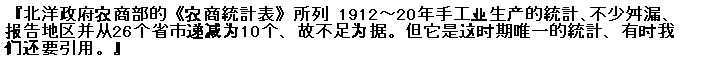 (北洋政府農商部による『農商統計表』に掲載された1912〜20年の手工業生産統計には漏れが多くあり,報告地域が26省から10省に減り,従って根拠とするには不十分である。しかしそれはこの時期の唯一の統計であるので,ときにはわれわれはそれを使わざるをえない)