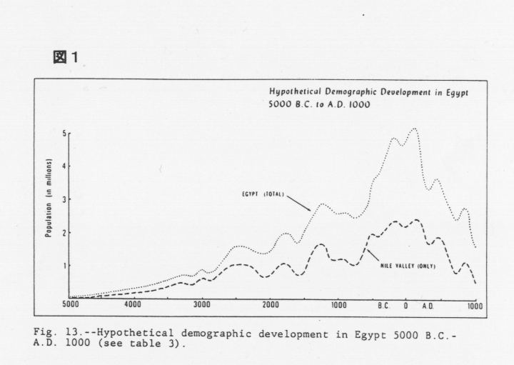 この推計における耕地面積当たりの人口密度は、上エジプトのある地域の場合、その神殿建設の労働投入量から考えて少なくとも約100人/平方キロメートルであったとしています。(ちなみに現代の人口密度は約300人/平方キロメートルであります)[Butzer 1976:87]また、このブッツァーによる450万人という推計値は、19世紀初頭のパンザックによる統計修正値と偶然にも一致する点が興味をそそります。参考までに、図1で、BC5000年からAD1000年まで6000年にわたる期間のエジプトの人口変動に関するブッツァーの推計を示しておきました。
