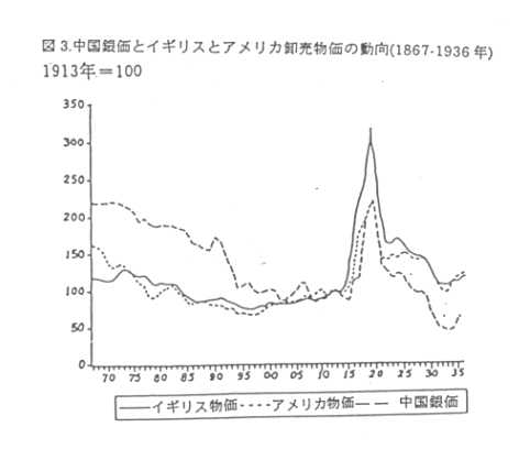 図3 中国銀価とイギリスとアメリカ卸売物価の動向(1867-1936年)