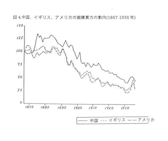 世界の先進工業国が金本位制に移行したにもかかわらず、中国は1935年まで銀本位制を維持し続けました。そのため中国貨幣の銀は他の国家では一種の商品ということになります。また、中国は主要な銀生産・消費国ではなく、銀の価格は国際市場に左右され、自ら決定はできません。価格の決定権は主にアメリカとイギリスにありました。図3から当時の中国における銀価格をみると,下降趨勢が認められ、中国貨幣のインフレが始まりました。
