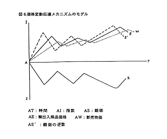 貨幣価格変動の分析を通じて、三者の関係が分かります。中国近代における物価変動は、図5のように、最初に国際市場の銀価格が下降し、その次に、中国の輸出入品価格が上昇し、最後に中国の一般的物価水準が上昇するという経緯をたどりました。この関係から、中国近代における物価変動メカニズムをモデル化したものが図6です。もし、上記三種の物価の週間あるいは月間の指数が入手できるなら、モデルの有効性が検証できます。