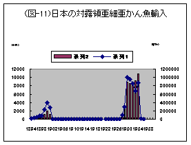 露領漁業による漁獲物が『 日本外国貿易年表 』に計上されていれば、木材を上回る露領亜細亜からの最重要輸入商品になっているはずである。日ソ間で締結された漁業条約によって北洋に出漁して漁獲する以外に、日本はソ連極東漁業機関から魚を買い入れている。『 日本外国貿易年表 』によれば、塩鮭及塩鱒の露領亜細亜からの輸入額は1902年の140万円(輸入額の24%)から日露戦争期の1904〜1905年の急減後、1906年には110万円(輸入額の80%)まで回復した。しかし、その後は皆無の状況が続いた。塩蔵魚(鹹魚)の輸入が復活したのは1928年のことであり、その後毎年増加の傾向にあり、1934年には1,080万円(同33%)を記録した。しかし、翌年には激減し、さらに1936年以降全く輸入されなくなったのである。このような輸入傾向をどのようにみたらよいのだろうか。