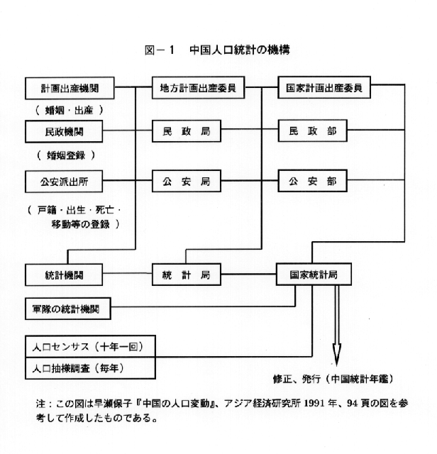 戦後中国人口の研究に先立って、中国の統計システムを理解することが必要である。中国の人口・労働力統計システムは5つの機関から構成されている( 図−1 )。