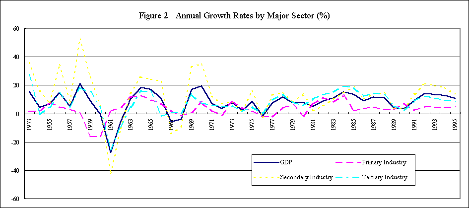 Table A.8 presents real growth rates of GDP for 1953-1995. Figure 2 displays real growth rates of GDP by major sector. From this figure it can easily be seen that the growth figures of secondary industry experienced remarkable jumps and drops for 1953-1970 and that those of primary industry suffered serious recession in the late 1950s and stagnated after 1985. Figure 3 shows cumulative real growth figures for 1952-1995. This figure clearly shows that China entered a growth era after 1970 and a rapid growth era after 1980. Only growth figures of secondary industry showed remarkably high values after 1970 while growth figures of primary industry stagnated for the period and those of tertiary industry paralleled those of the macro growth figures.