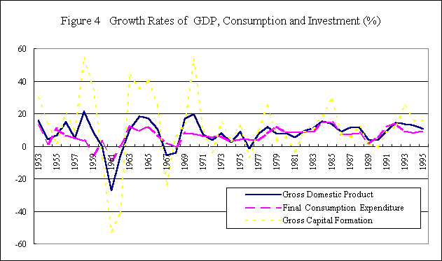 Tables A.13 to A.20 shows details of consumption related data while Tables A. 20 to A.24 shows those of investment related data. Figure 4 visualizes movement of real growth rates of GDP, consumption and investment for 1953-1995. It can be seen from this figure that growth rates of gross capital formation showed drastic jumps and drops for 1953-1970 and cyclical movements during the whole period 1953-1995.